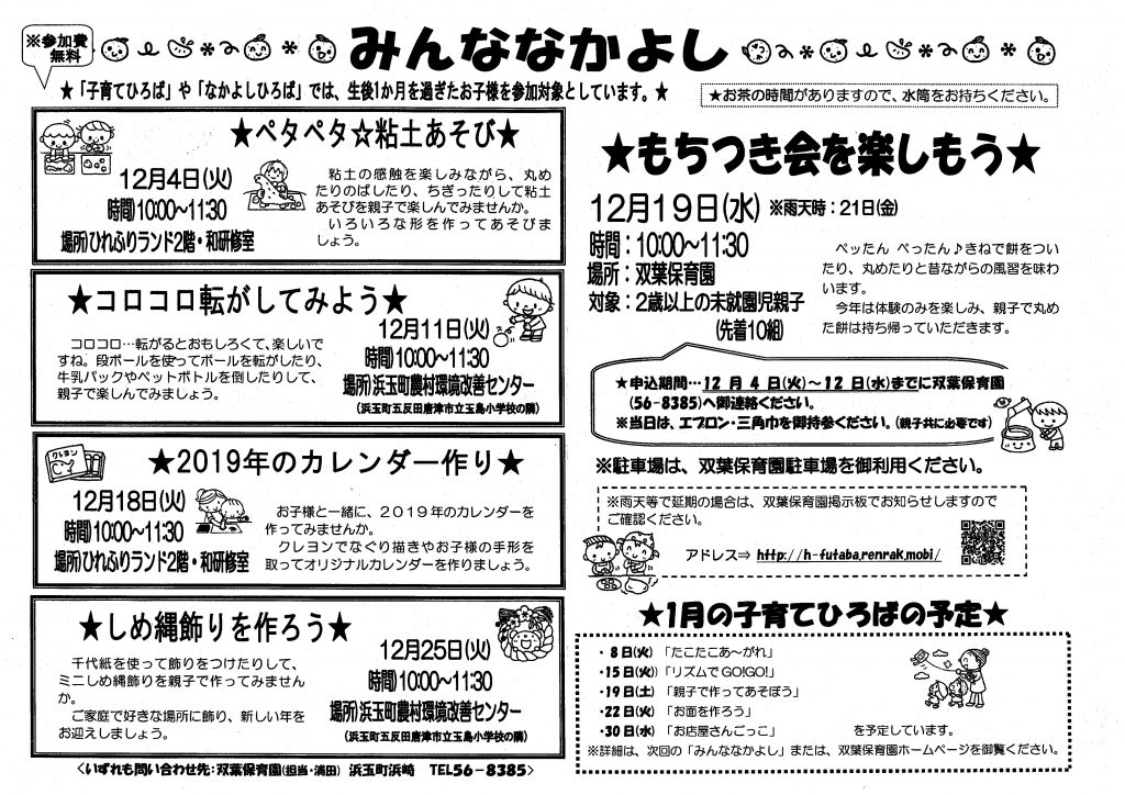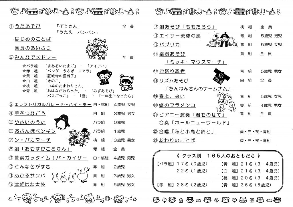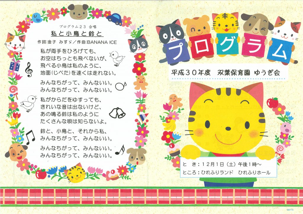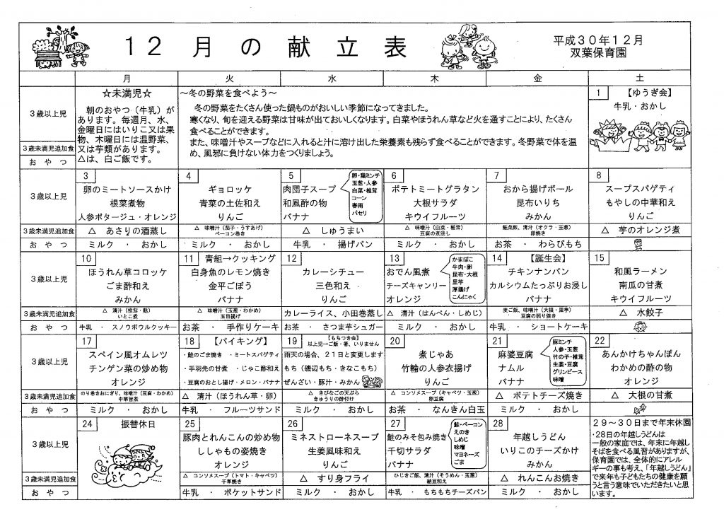 12月の献立表 2018.11.30 12月の献立表 【PDFファイル 95.3KB】 ゆうぎかいプログラム 2018.11.28 平成30年度 ゆうぎかいプログラム 【PDFファイル 259KB】 みんななかよし 12月号 2018.11.28 みんななかよし 12月号 【PDFファイル 259KB】