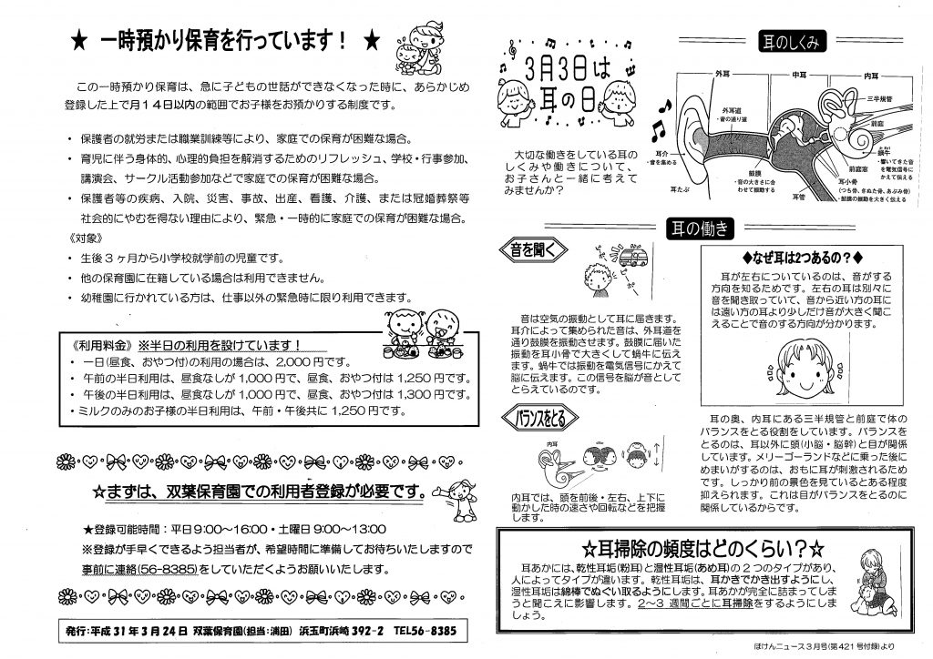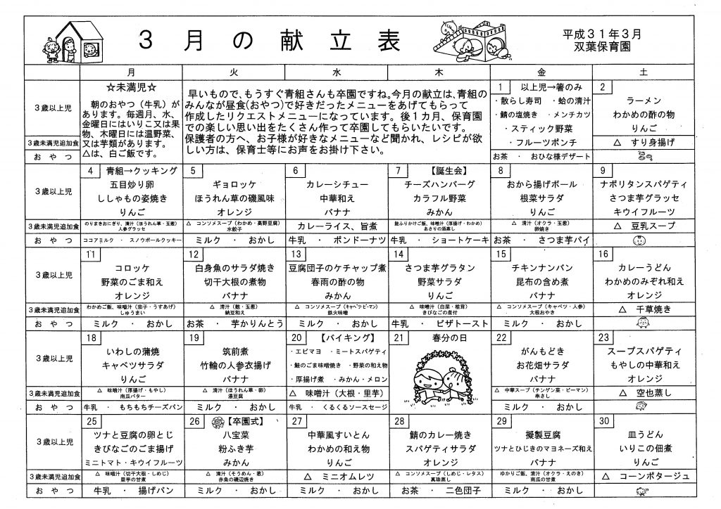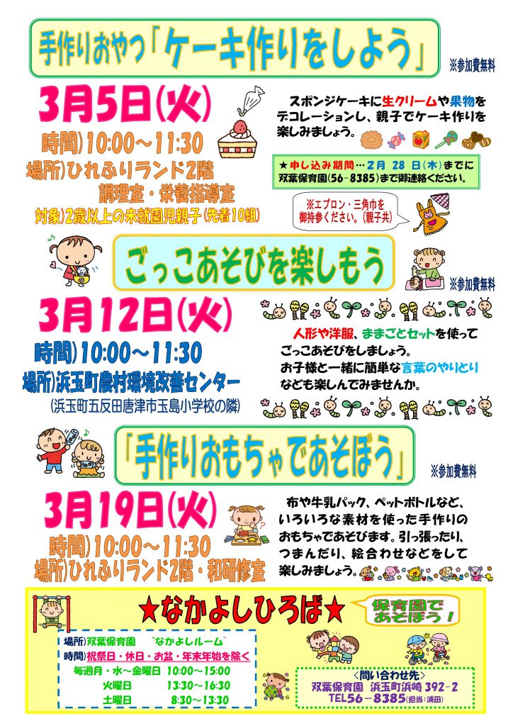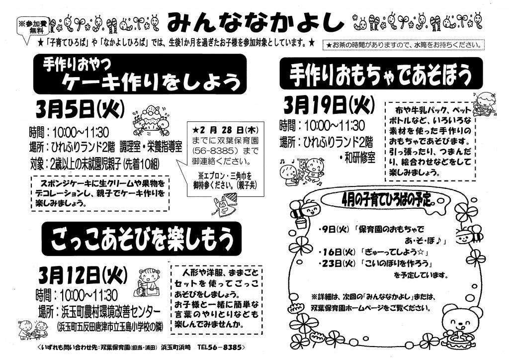 3月の献立表 2019.2.27 3月の献立表 【PDFファイル 99.7KB】 子育てひろば(3月5日・12日・19日)のご案内 2019.2.27 子育てひろば(3月5日・12日・19日)のご案内 【PDFファイル 456KB】 みんななかよし 3月号 2019.2.27 みんななかよし 3月号 【PDFファイル 205KB】