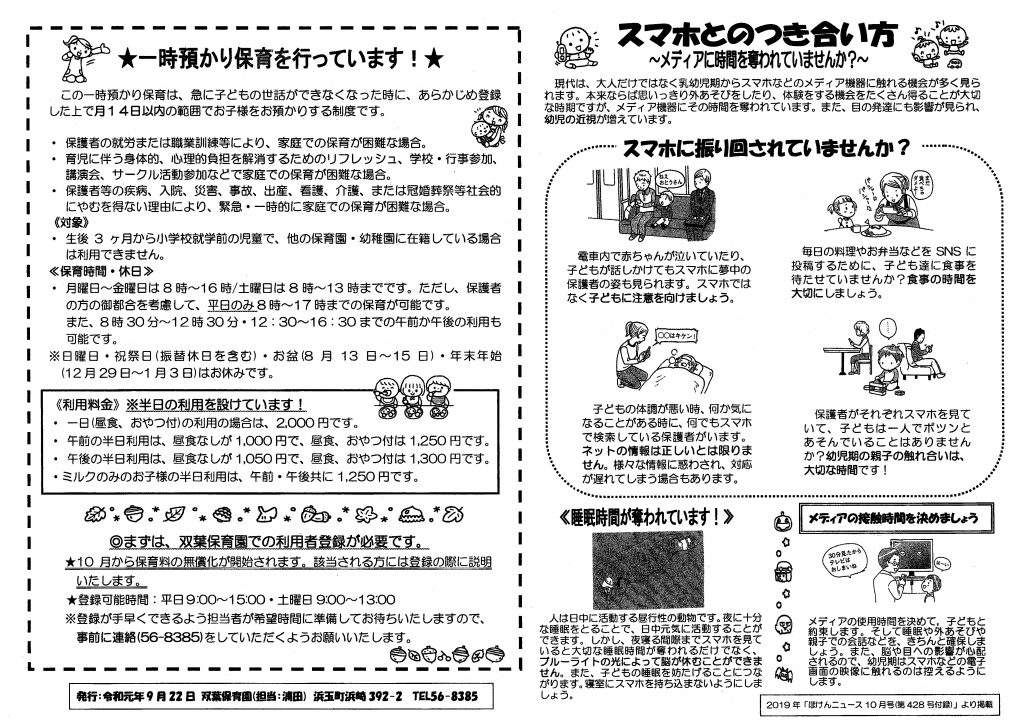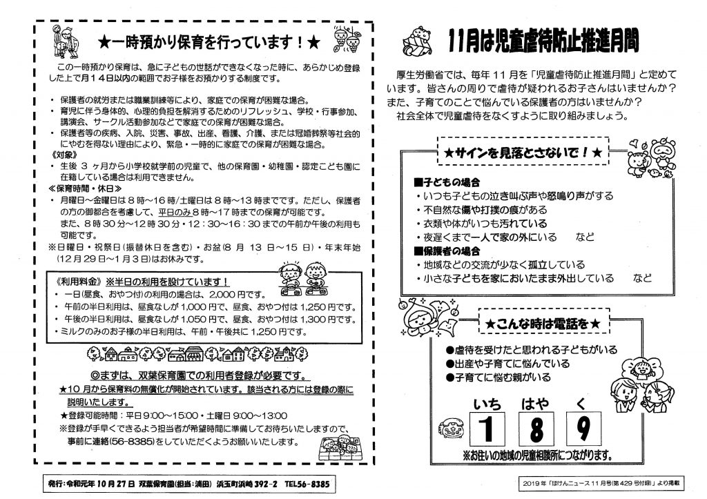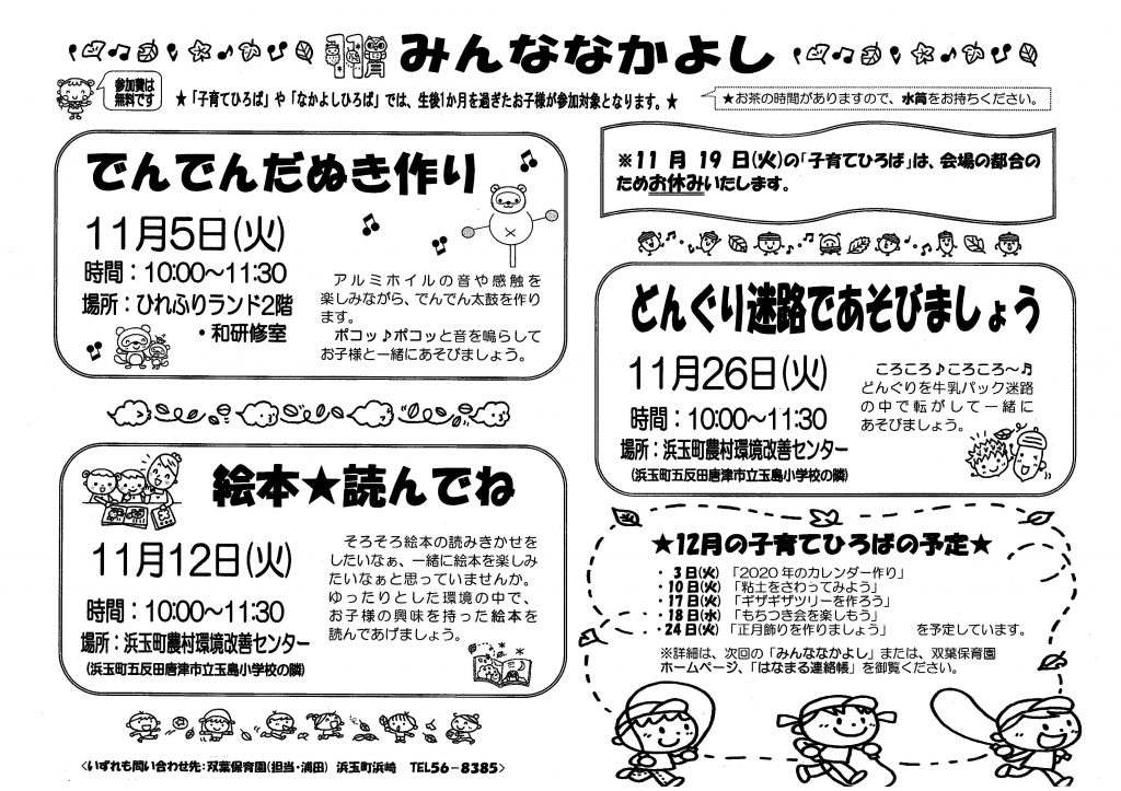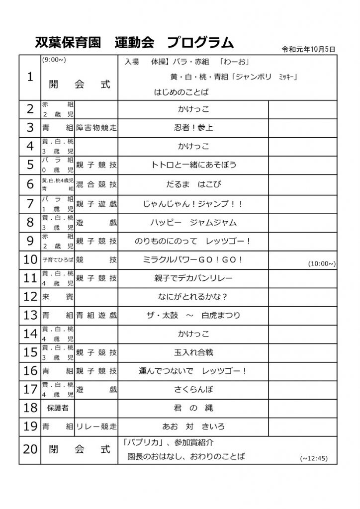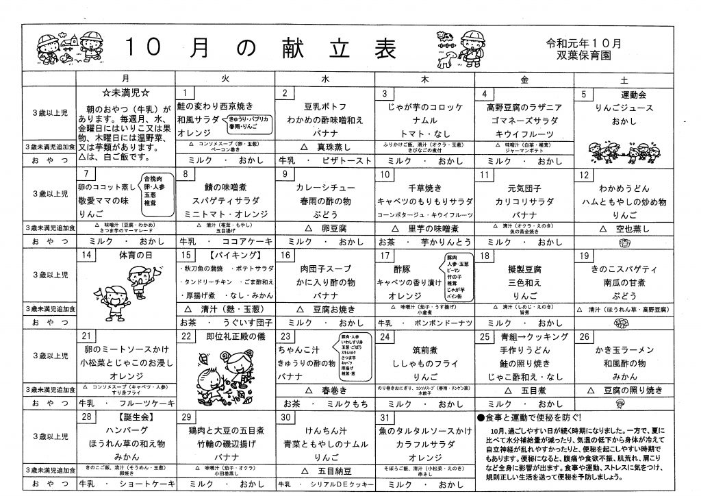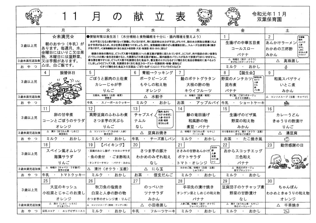 11月の献立表 2019.10.30 11月の献立表 【PDFファイル 80.4KB】 みんななかよし 11月号 2019.10.30 みんななかよし 11月号 【PDFファイル 143KB】 運動会プログラム 2019.10.4 運動会プログラム2019 【PDFファイル 336KB】 みんななかよし 10月号 2019.10.3 みんななかよし 10月号 【PDFファイル 295KB】 10月の献立表 2019.10.3 10月の献立表 【PDFファイル 102KB】