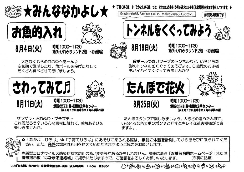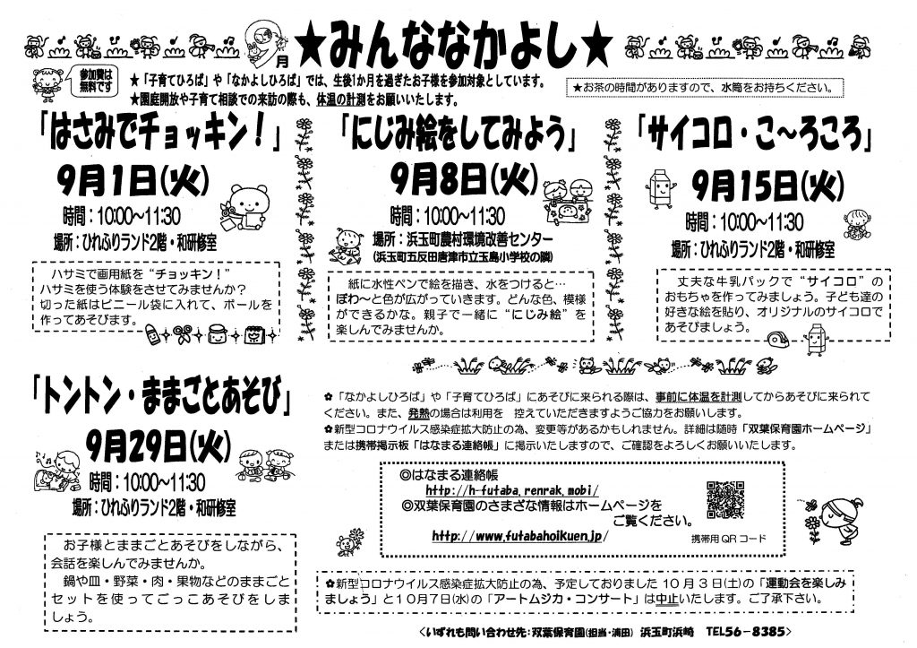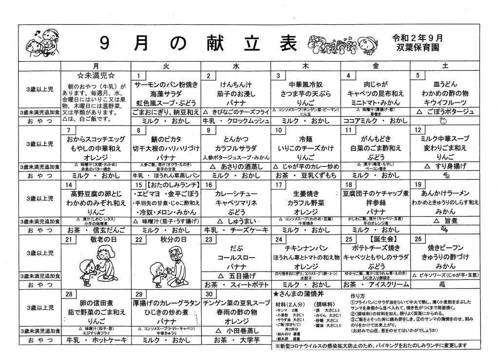 9月の献立表 2020.8.29 9月の献立表 【PDFファイル 107KB】 みんななかよし9月号 2020.8.24 みんななかよし 9月号 【PDFファイル 255KB】 みんななかよし 8月号 2020.8.1 みんななかよし 8月号 【PDFファイル 243KB】