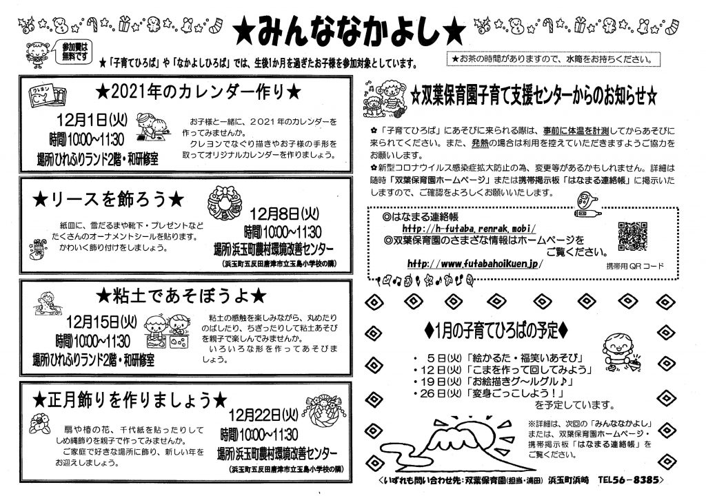 みんななかよし 1月号 2020.12.28 みんななかよし 1月号 【PDFファイル 257KB】 1月の献立表 2020.12.24 1月の献立表 【PDFファイル 111KB】 みんななかよし12月号 2020.12.7 みんななかよし 12月号 【PDFファイル 225KB】
