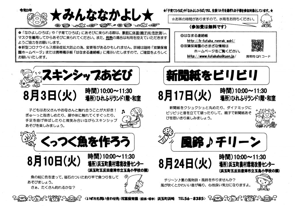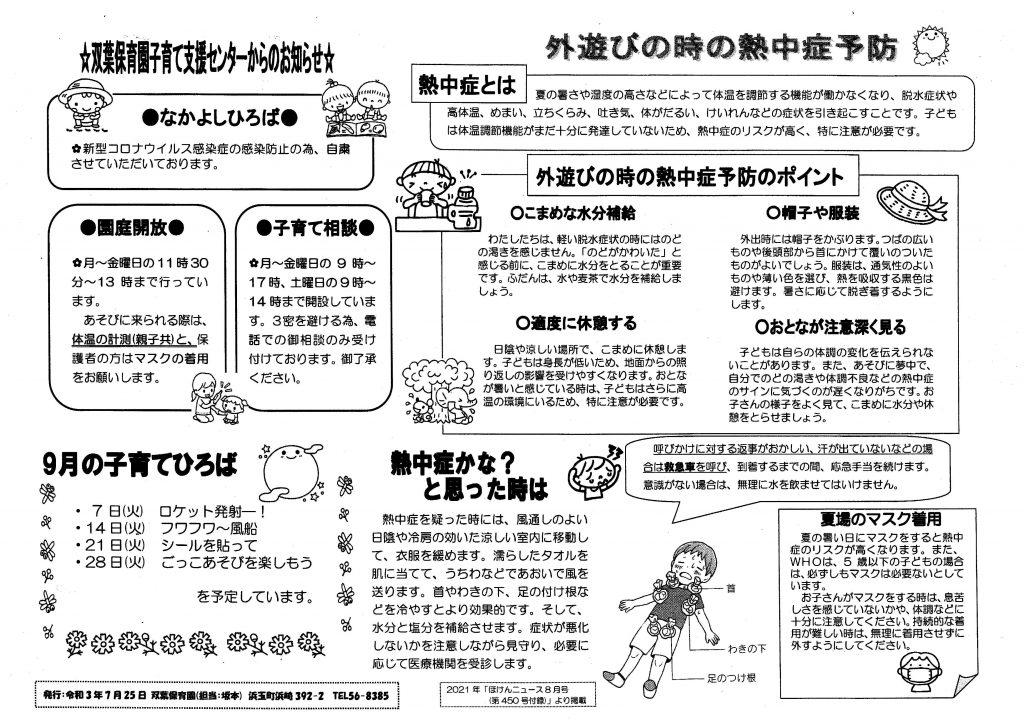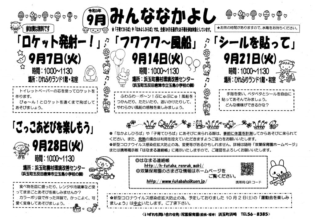 ※新型コロナウイルス感染症の状況によっては、9月の子育てひろばも臨時休業になる可能性があります。詳細は「双葉保育園ホームページ」または「はなまる連絡帳」にてお知らせいたします。