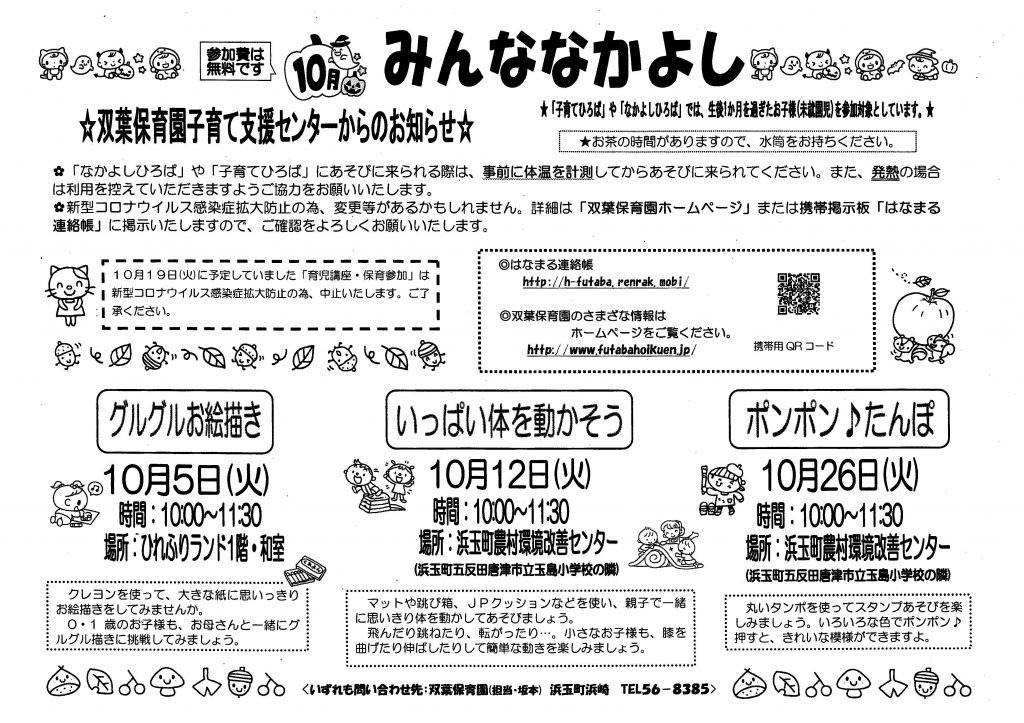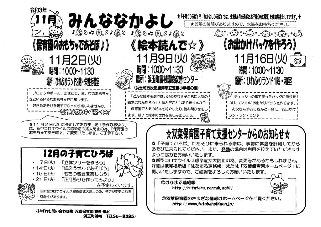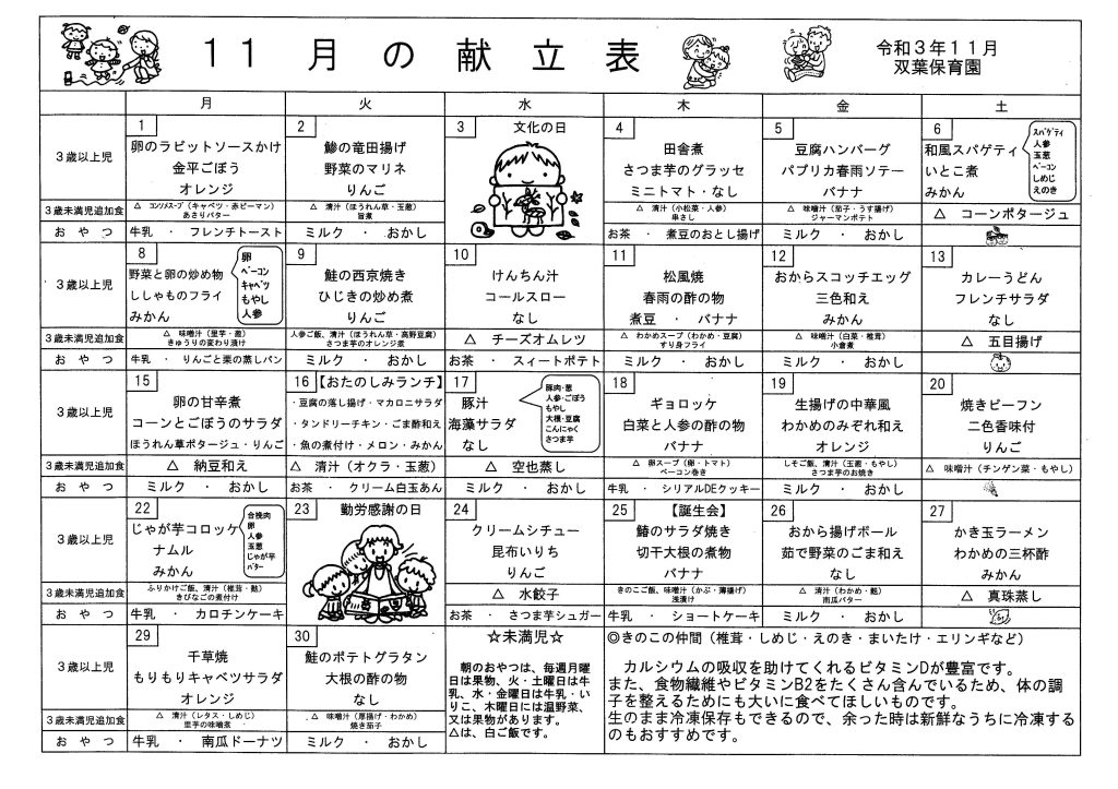 11月の献立表 2021.10.29 11月の献立表 【PDFファイル 100KB】 みんななかよし11月号 2021.10.28 みんななかよし 11月号 【PDFファイル 232KB】 みんななかよし10月号 2021.10.5 みんななかよし 10月号 【PDFファイル 239KB】