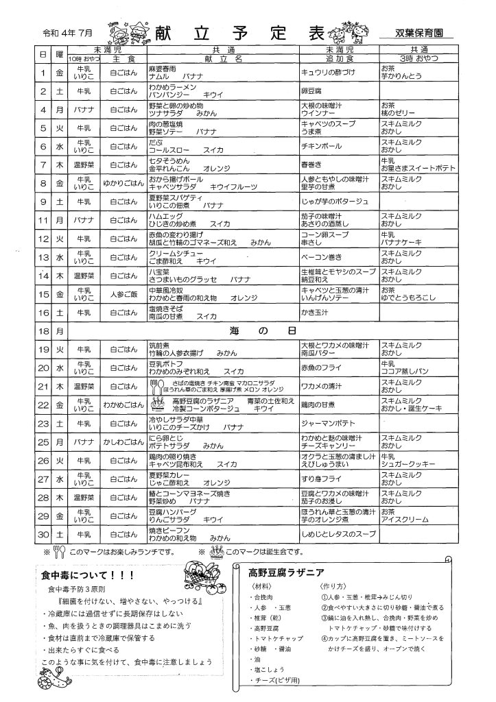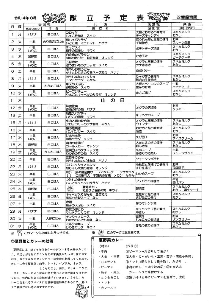 みんななかよし 8月号 2022.7.28 みんななかよし 8月号 【PDF/317KB】 8月の献立表 2022.7.28 8月の献立表 【PDF/143KB】 7月の献立表 2022.7.1 7月の献立表 【PDF/120KB】